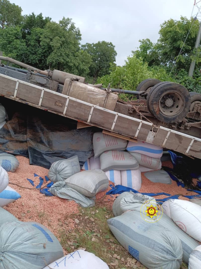 The incident occurred at Mile Forty when a Kia truck loaded with groundnuts and carrying eight passengers veered off the road.